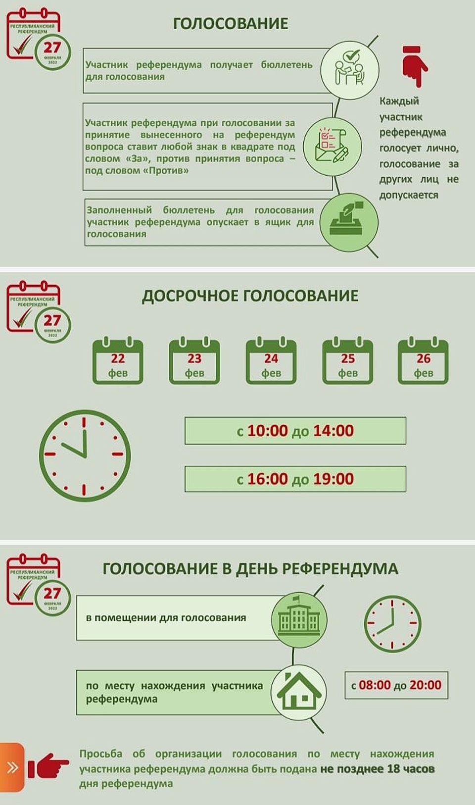 Гражданин может обратиться с просьбой об организации голосования по месту своего нахождения в любое время после образования комиссии, а в день референдума до 18.00. Голосование по месту нахождения гражданина организуется только в день референдума.