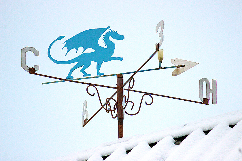 Устройство флюгера несложное. Флюгарка — пластина-фигурка на стрелке с противовесом. Поворотная ось. И указатель сторон света, то есть роза ветров: закрепленные стрелки — север, юг, запад, восток, которые сориентированы по сторонам света. Именно такой прибор Дмитрий когда-то установил на доме своих родителей.