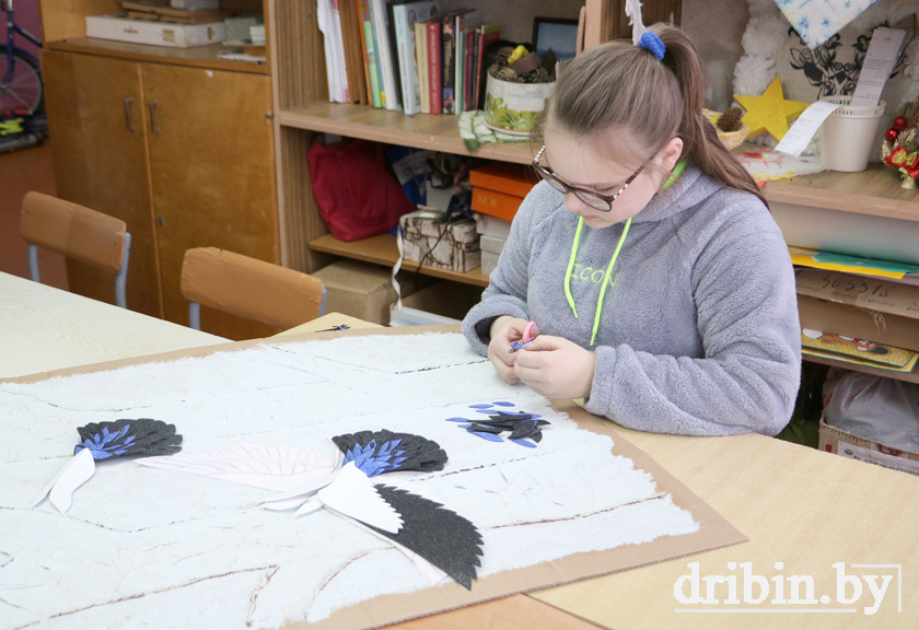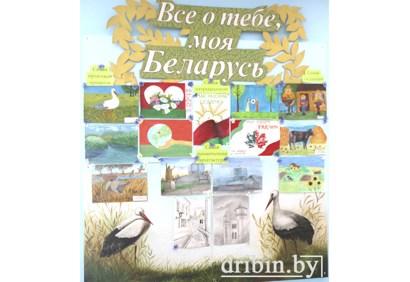 С художественным талантом Натальи Николаевны знакомимся, уже переступая порог школы. Вот на одной из стен в холле на голубом фоне изображена стая аистов, обрамленная национальным орнаментом,— трогательное признание в любви родной Беларуси. Сюжет хоть вполне себе и традиционный, автор преподнесла его нетривиально. Чуть дальше — красочный стенд «Все о тебе, моя Беларусь» с работами учащихся, на котором тоже живописно «приземлились» отдохнуть эти грациозные птицы. Но здесь они представлены в более сложной технике исполнения — в виде барельефа, к которому мы еще вернемся… К слову, стенд можно было видеть на прошлой августовской педагогической конференции в качестве экспозиции. На другой стене — серия картин, посвященная птицам, от старательного ученика Натальи Николаевны, изящный батик — работа ее же выпускницы, и вокруг еще много чего, что невольно притягивает взор и гостей школы, и, уверена, не перестает удивлять и тех, кто бывает здесь каждый день.