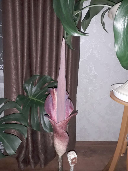 Настоящим рождественским сюрпризом для жительницы Дрибина Надежды Антоновой стало цветение такого уникального тропического растения, как аморфофаллус. Сюрпризом необычного вида цветок можно назвать уже потому, что в зимний период растение, как правило, находится в состоянии покоя, но самое главное — цветок появился впервые за двадцать лет! Именно столько времени прошло с тех пор, говорит Надежда Алексеевна, как ей подарили клубень экзотического аморфофаллуса. Увлеченная цветоводством, она в качестве эксперимента его посадила в горшок. Растение оказалось не очень прихотливым в уходе, и все эти годы женщина терпеливо о нем заботилась, пересаживала по мере необходимости и с любопытством наблюдала, как растение развивается и набирает силу. И вот, в самый неожиданный момент, видимо, в качестве благодарности за терпение и заботу, аморфофаллус преподнес своей хозяйке приятный подарок.