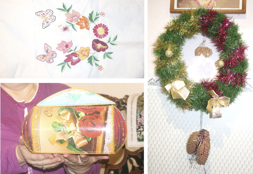Редакционная машина приехала по указанному адресу Тамары Макаренко, и мы были приятно удивлены. Вокруг дома все украшено по-новогоднему. Сверкающие разноцветные гирлянды на окнах дома, переливающиеся новогодние игрушки — все это создает праздничную атмосферу зимнего праздника. В самом доме также все украшено по-новогоднему. Оригинальные украшения Тамара Николаевна делает своими руками из подручных материалов. На стене — аппликация снеговика из бумаги, интересные и праздничные новогодние украшения из старых лампочек, фонарики в технике «оригами», разноцветные шары из ниток, шкатулки из старых открыток… Такие творения создают красоту, праздничное зимнее настроение и уют в доме. По словам хозяйки дома, всякий раз она придумывает что-то новое. Множество полезных и красивых вещиц и сувениров украшают дом, радуют родных и близких людей, прохожих односельчан. Также в доме стоит нарядная елка, украшенная в стиле 60-х годов, на ней множество старых советских игрушек, которыми Тамара Николаевна очень дорожит.