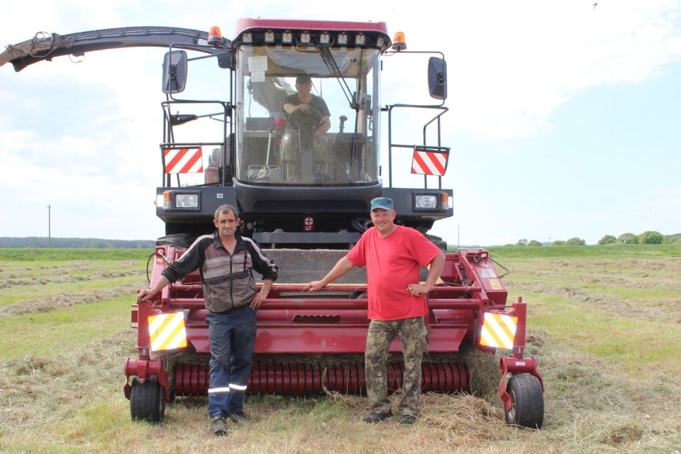 Объёмы уборки трав с каждым днем нарастают. Чему способствует хорошая организация работы и высокая квалификация специалистов. По словам главного агронома хозяйства, в кормозаготовке задействована вся кормоуборочная техника. В том числе 3 кормозаготовительных комплекса. Не так давно машинно-тракторный парк хозяйства пополнился новым высокопроизводительным комплексом КВК-800, на котором работает опытный механизатор Николай Волков, именно он обеспечивает бесперебойную работу уборочного конвейера. Новый агрегат удобен тем, что имеет специальный бачок, в который заливается консервант, при работе комплекса он поступает в зеленую массу, поэтому в траншею сенаж поступает уже с консервантом. Покос трав на тракторе МТЗ-3032 в сцепке с косилкой КПР-9 осуществляет Валерий Яцутко. На тракторе МТЗ-82 с граблями собирает траву в валки Юрий Закревский, он готовит фронт работ для пресс-подборщика, на котором трудится Александр Козлов. Отвозят зеленую массу на тракторах МТЗ- 1221 с прицепами Олег Лисичкин и Евгений Москалев. В сельскохозяйственной кампании принимают участие как постоянно работающие водители, так и привлеченные специалисты – на собственных грузовых автомобилях отвозят зеленую массу к сенажным траншеям Николай Яцутко и Александр Кухаренко.