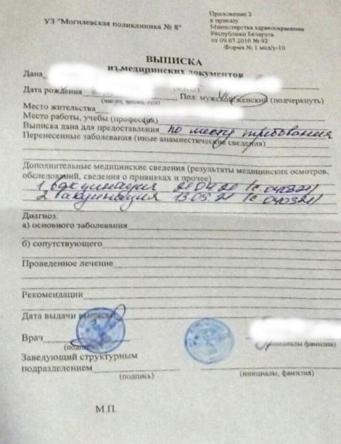 Всем, кто получил прививку против COVID-19 и не планирует выезд за пределы страны в течение года после полного курса вакцинации (2 прививки), будет выдаваться выписка из медицинских документов, подтверждающая проведение вакцинации-1 и вакцинации-2 (см.фото).