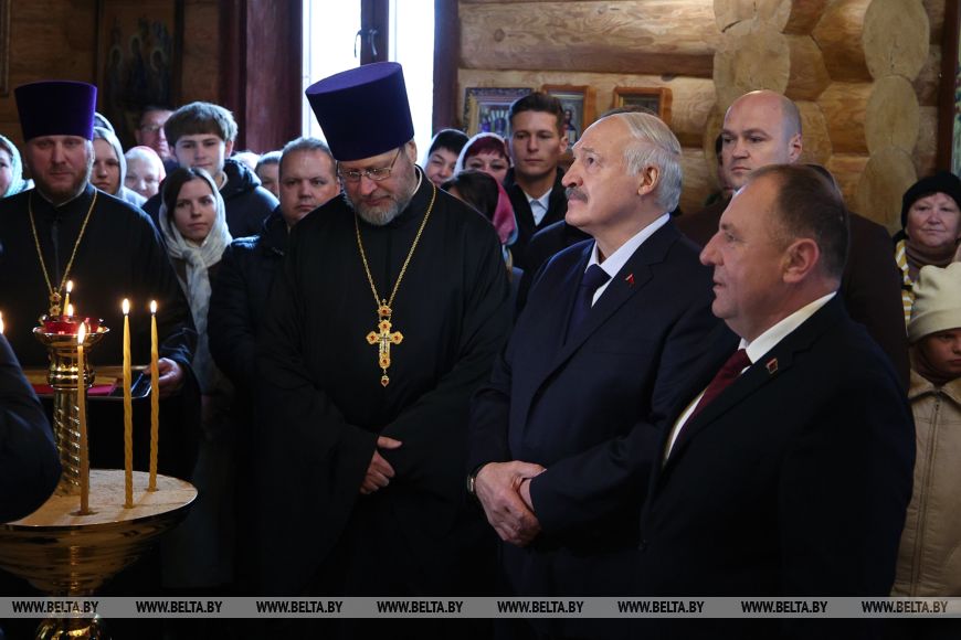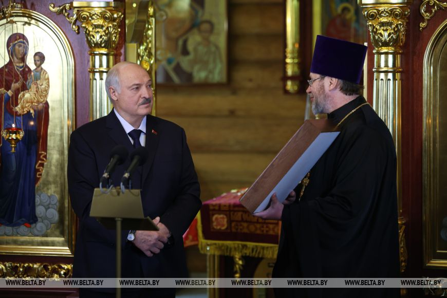 «Много лет назад я бывал здесь не единожды. Помню, где-то здесь была ферма. Помню каждый километр дороги. Тем более что я раньше работал с вами. Помню руководителя вашего хозяйства, Александра Андреевича Попкова, с которым пришлось еще работать в Минске, — рассказал глава государства. — Приятно видеть ваши добрые и как всегда улыбчивые глаза. Приятно бывать в таком храме. Откровенно говоря, это любимые мои храмы — которые построены просто, без помпезности, особенно если они исполнены в дереве».