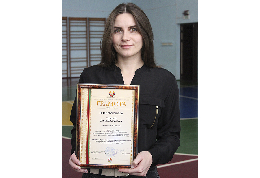 В номинации «Организация физкультурно-оздоровительной и спортивно-массовой работы с населением в формате деятельности ФОЦ и ФОК» 3-е место заняла Дарья Гузенко, инструктор-методист по физкультурно-оздоровительной работе Дрибинского центра физкультурно-оздоровительной работы (на фото).